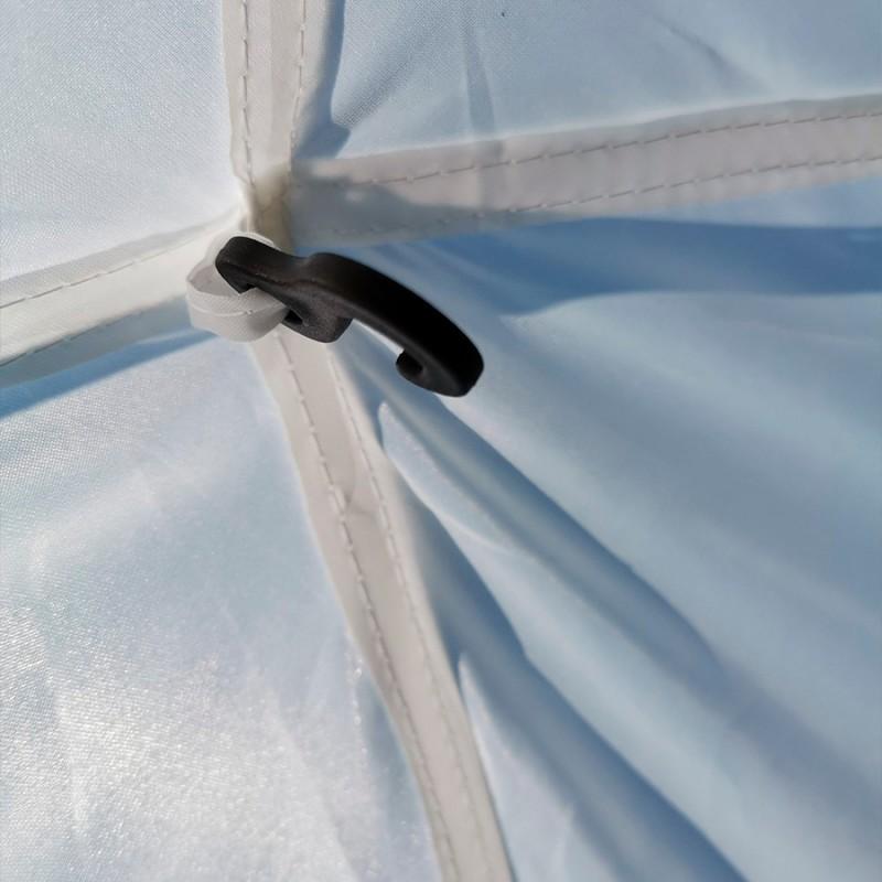 Сборка данной палатки простая и интуитивно понятная. Капсула крепится к каркасу с помощью пластиковых крючков. Тент фиксируется к каркасу завязками. Дуга тамбура продевается внутрь.