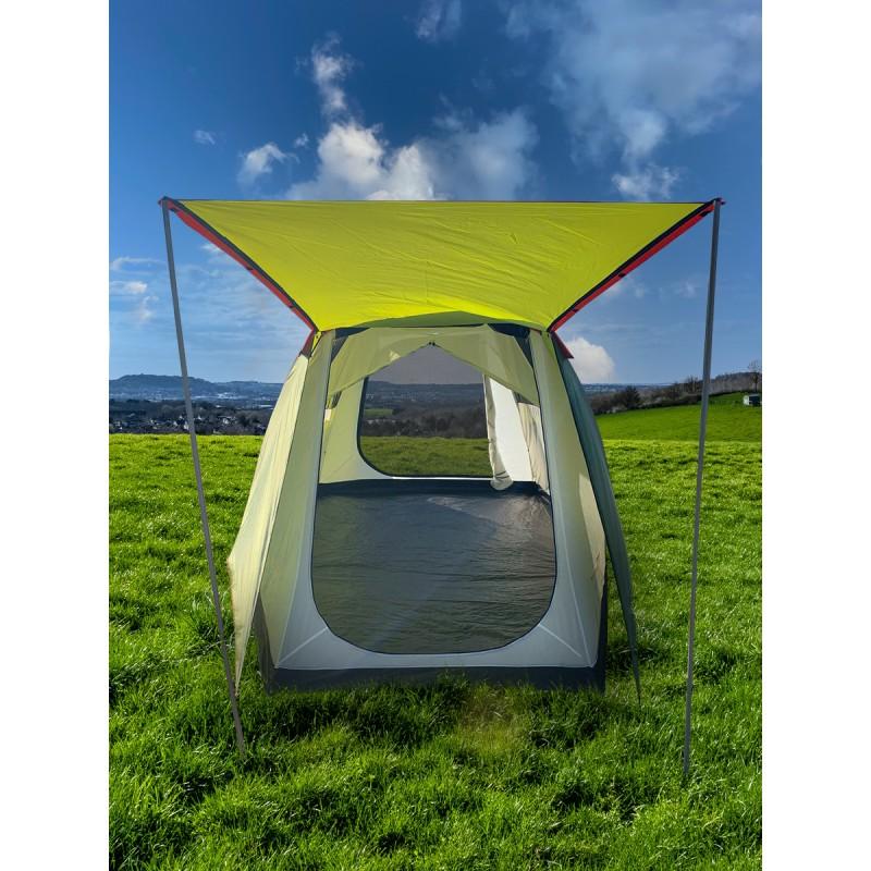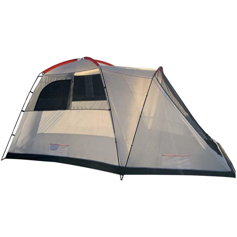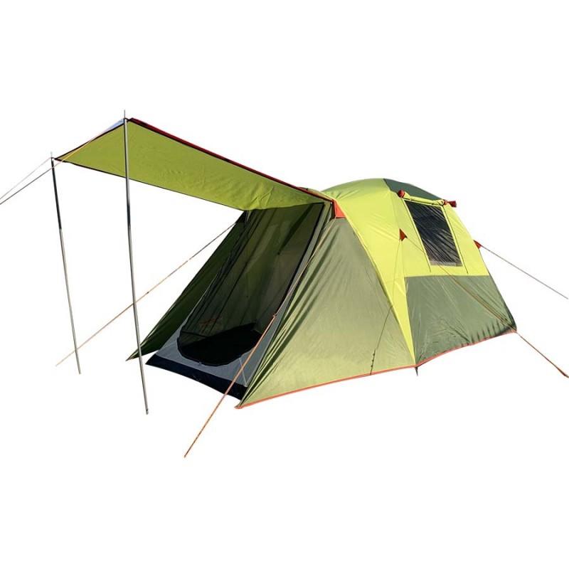 Тамбур совмещен с палаткой. Пол по всей площади палатки. Два входа с москитными сетками.Палатка для 4-6 человек. |