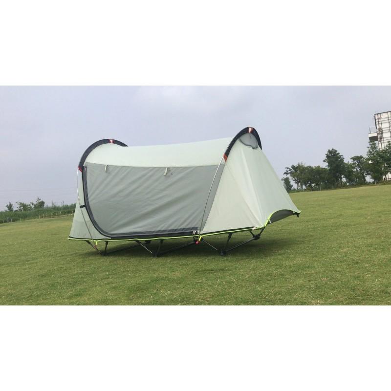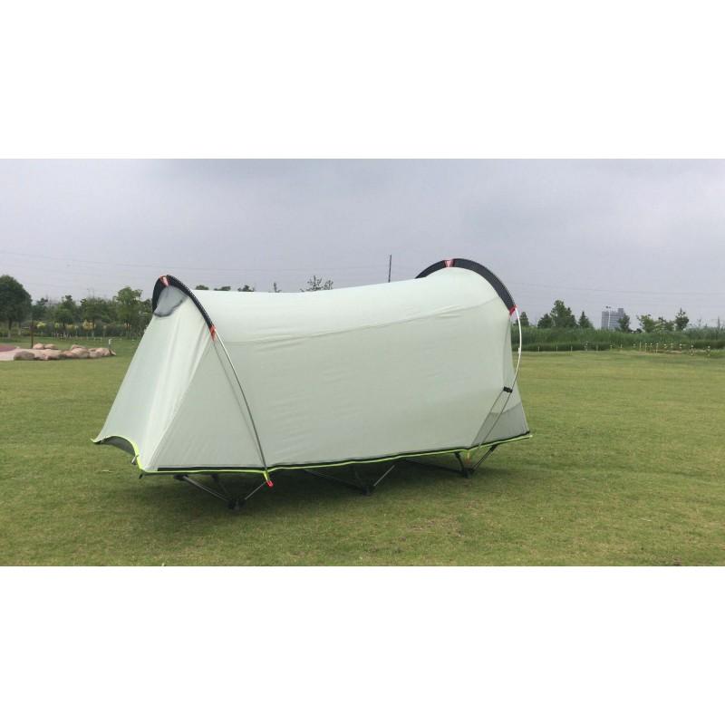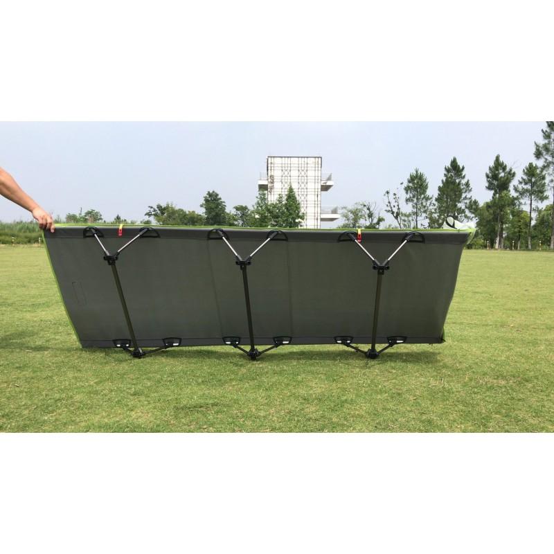 Каркас алюминиевый и прочный. Главный плюс этой палатки – это то, что туристическая кровать находится высоко от земли и защищает от холода. К тому же ее можно использовать отдельно от самой палатки. Например днем на отдыхе можно просто использовать ее как туристическую мебель, а вечером растянуть тент и это уже полноценная одноместная палатка.