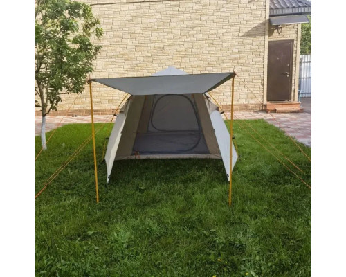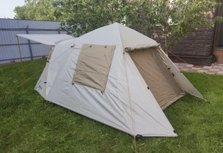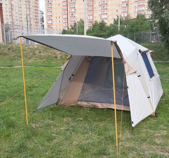 Палатка имеет козырек и тамбур. Это делает ее более просторной, удобной для готовки на свежем воздухе. При необходимости в тамбуре можно разместить свои вещи или обувь, чтобы они не отнимали спальное пространство.